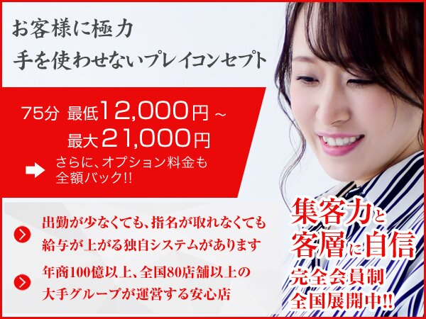 | 仕事内容 | 「ノーハンドで楽しませる人妻」は、その名の通り、お客様が何もしなくても楽しめるサービスであることがコンセプトで、外国にある「ノーハンドレストラン」で繰り広げられる『ハーレム』と風俗サービスを融合させた、王様気分で贅沢で濃厚なサービスを楽しめる新感覚ヘルス店です。 お客様にとってどれだけ魅力的なサービス内容か? これが、まさに貴女のお給料に直結します。 もしサービス内容にコンセプトがなければ、単純にお客様は数百店舗の数千名いる女性の中から、一番自分のタイプで一番値段が安いお店を選ぶことでしょう。 しかし、それでは働く側の給与は安定しません。 当店では、コンセプトを設けることで、採用基準に達した女性であれば、誰でも、またいつからでもしっかりと稼げる環境をご用意して貴女をお待ちしております。 |