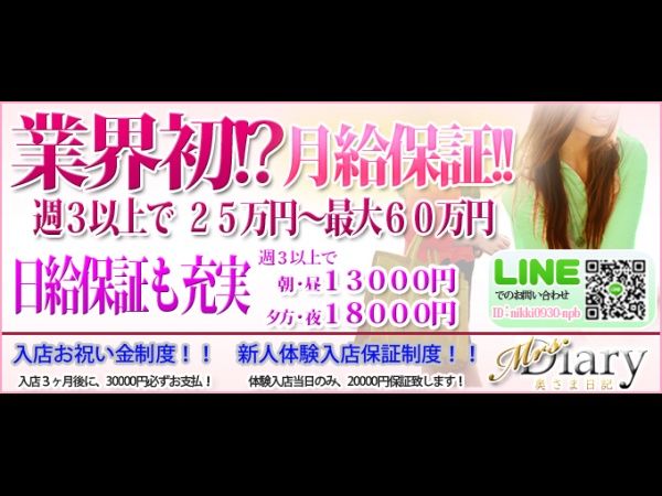 | 給与 | ◆業界最先端!日給・月給・選べるMystyle保証プラン◆ 日給・月給・保証制度が充実! 貴女に合った保証内容で無理なく稼いで頂くことができます。 ~月給60万円保証の場合~ ◆ 週5日~6日出勤(月24日出勤) ◆ 1日7時間以上勤務 ◆ 月間の本指名30本以上 ※ (例)週6日×25.000円=150.000円×4週=600.000円 日給の収入に置き換えると1日25000円になります。 ~月給40万円保証の場合~ ◆ 週3日~4日出勤(月16日出勤) ◆ 1日7時間以上勤務 ◆ 月間の本指名20~25本 ※ (例)週4日×25.000円=100.000円×4週=400.000円 日給の収入に置き換えると1日25000円になります。 ~月給30万円保証の場合~ ◆ 週2日~3日出勤(月12日出勤) ◆ 1日7時間以上勤務 ◆ 月間の本指名15~19本 ※ (例)週3日×25.000円=75.000円×4週=300.000円 日給の収入に置き換えると1日25000円になります。 ~月給20万円保証の場合~ ◆ 週1日~2日出勤(月8日出勤) ◆ 1日7時間以上勤務 ◆ 月間の本指名10本 ※ (例)週2日×25.000円=50.000円×4週=200.000円 日給の収入に置き換えると1日25000円になります。 ◆完全日給保証制度◆ 週3日以上の出勤女性に限り 下記の金額を日給保証させて頂きます 週3日以上 5時間勤務 昼 8000円 夜 13000円 週4日以上 6時間勤務 昼 10000円 夜 15000円 週5日以上 7時間勤務 昼 13000円 夜 18000円 ※但し2ヶ月以内に本指名が10本未満の場合は無効となります。 【基本給】 60分コース 6,000円~8,000円 75分コース 7,500円~9,500円 90分コース 9,000円~11,000円 100分コース 10,000円~12,000円 120分コース 12,000円~14,000円 180分コース 18,000円~20,000円 |