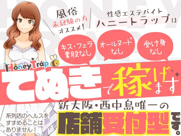 | 仕事内容 | 【当店のお仕事の流れ/オプション等は省く】 お客様は店舗にて受付する ↓ ご対面→近隣のホテルへ移動→脱衣 ↓ プレイ前のシャワー(お客様のみ) ※一緒に浴びる事はありません。 ↓ 全身オイルマッサージ(オイル又はパウダー) ↓ 性感マッサージ(睾丸・鼠径部などローションを使ってハンドサービス) ↓ ハンドでフィニッシュ&男の潮吹き ↓ プレイ御のシャワー(お客様のみ) ※一緒に浴びる事はありません。 ↓ ホテル退出後、お見送り ↓ 事務所へ戻ってくる 【ハニートラップの3つのメリット】 ①ソフトサービスだから病気の心配なし! 「ヘルス行為」はもちろん、「舐めない」「触られない」ハンドサービスメインのお仕事なので性病のリスクは0%! 整理中でもお仕事が可能です。 ②日給保証制度と全額日払いのお給料 悪天候などでお客様の来店が少なくてもご安心ください。 当店では『出勤するだけ』でお給料が発生します。 もちろん、お給料はあなたの頑張り次第で上がっていきます。店長ブログでも詳しく書いているのでチェックしてみてください! ③未経験でも経験者でもあなたに合った優遇でお迎えします 当店在籍女性の75%が風俗未経験からスタートしています。きちんと新人期間は設けるのでプレッシャーを感じることなくお仕事についていただけます! さらに体験入店で事前にお仕事内容を確認できるので、ご自身が十分納得してからの入店が可能です。 ※実技レッスン&ビデオなどで習得する回春性感マッサージ (睾丸・鼠径部などオイルマッサージ) |