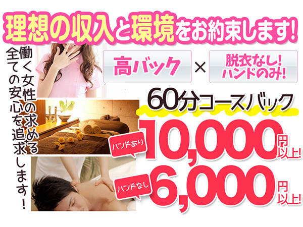 | 仕事内容 | 関西発!ソフトサービスにエステ・マッサージ・リフレ店。 女の子は【脱がない・なめない・触られない】 簡単なマッサージとハンドサービスだけで高収入が 得られるお店です。エステという業種のお店で女の子が脱いだり、 舐めたりしなくてよいお店です。 お客様から舐められたり、 触られたりなどもありません。 |