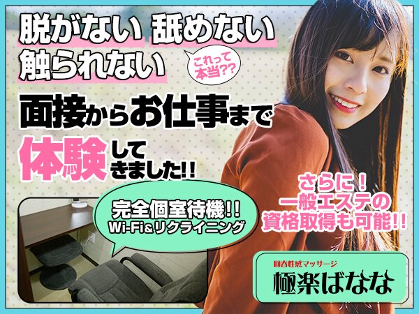 極楽ばなな池袋店は、「笑顔で仕事に一生懸命」な女性を募集しています!!「個室待機!一般エステ資格取得可能!」なマッサージ店!キス・受け身・全裸一切ありません♪